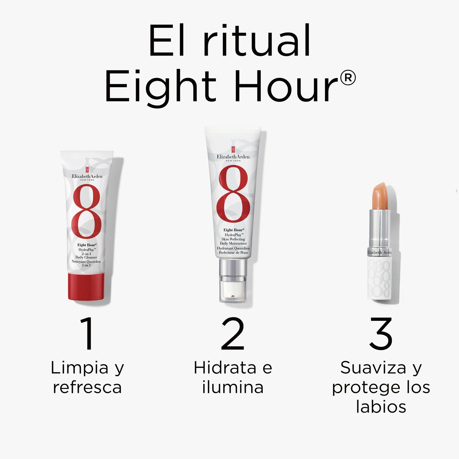 - Eight Hour Hydraplay Mousse de limipieza diaria 50ml:Aqua/Water/Eau Kaolin, Glycerin, Myristic Acid, Lactococcus Ferment Lysate, Palmitic Acid, Butylene Glycol, Glyceryl Stearate SE, Stearic Acid, Illite, Montmorillonite, Potassium Hydroxide, Lauric Acid, Phenoxyethanol, 1,2-Hexanediol, Caprylyl Glycol, G,lyceryl Stearate, Hydroxyacetophenone, Hydroxyethyl Acrylate/Sodium Acryloyldimethyl Taurate Copolymer, Parfum (Fragrance), PEG-100 Stearate, Polysorbate 60, Sorbitan Isostearate, Squalane, Tetrasodium EDTA, Xanthan Gum, Sodium Benzoate, Sodium Chloride,, Titanium Dioxide (CI 77891), Citrus Limon Peel Oil, Limonene, Linalool, Linalyl Acetate. B05820